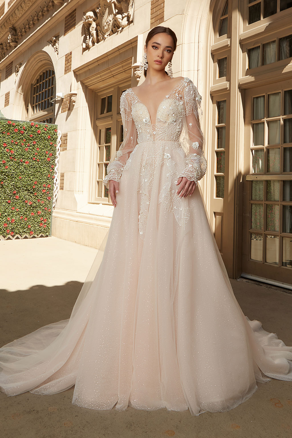 LIGHT AS AIR - THIS GORGEOUS GOWN IS A CONFECTIONERY OF LAYERS OF FRENCH TULLE TOPPED WITH BURSTS OF INTRICATE HAND BEADING. DECIDELY CHIC, THIS DEEP V-NECK A-LINE GOWN WITH JULIETTE SLEEVES IS A SHOWSTOPPER.