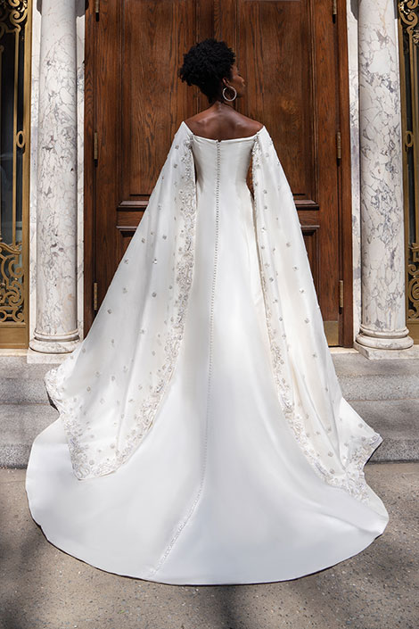 This exquisite a line gown is fit for royalty with it's zari beaded and embroidered angel wing sleeves and modified bateau/off the shoulder neckline gently and Tailored a-Line silhouette with chapel length train