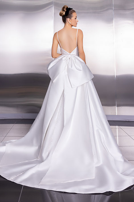 A Sophisticated Modern Classic silk Mikado A-Line Gown with a Modified Sweetheart/V- Neckline, DeepV- back, Spaghetti straps and an elegant detachable bow detail and dramatic chapel train.