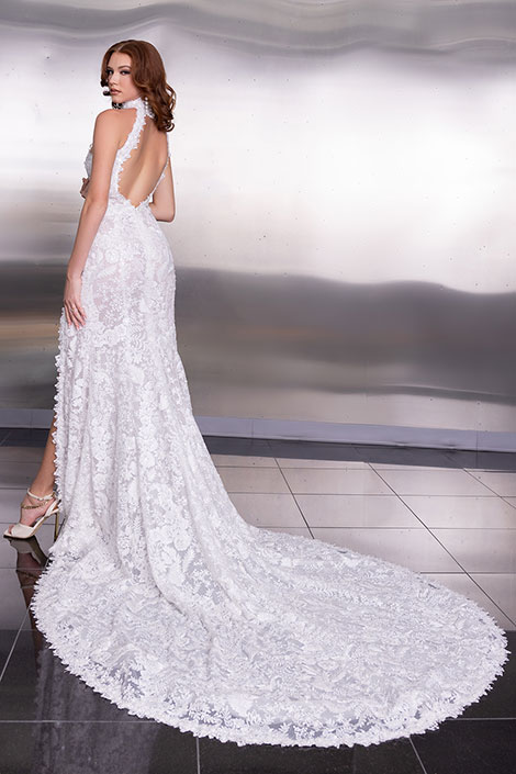 Delicately Embroidered French lace fit and flare high neck halter gown with modified keyhole back w. Scalloped chapel train. Crystal and sequin appliqués sparkle and the dramatic slit stuns. Matching Overskirt completes the look.